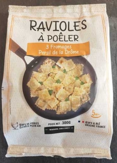 Ingrédients : Ravioles aux 3 fromages et persil de la Drôme 78% (Pâte : farine de blé tendre 28%, eau, œufs frais 3,7%, contient huile de tournesol et/ou huile de colza. Farce : fromage blanc frais 1... lire la suite