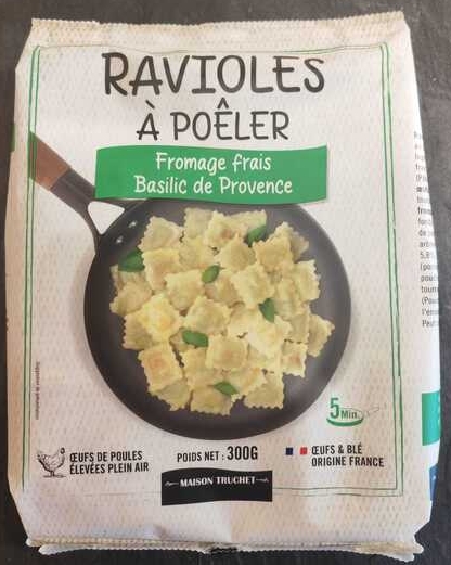 Ingrédients : Ravioles au fromage frais et au basilic de Provence 78% (Pâte : farine de blé tendre 28%, eau, œufs frais 3,7%, contient huile de tournesol et/ou huile de colza. Farce : fromage blanc f... lire la suite