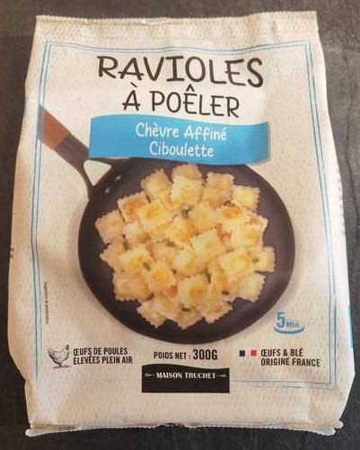 Ingrédients : Ravioles au fromage de chèvre et à la ciboulette 78% (Pâte : farine de blé tendre 28%, eau, œufs frais 3,7%, contient huile de tournesol et/ou huile de colza. Farce : fromage blanc frai... lire la suite
