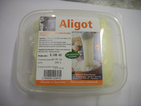 Au lait pasteurisé de vache Pommes de terre (61%), tome fraîche (30%), crème stérilisée, beurre, sel Poids net : 0.5kg Origine : Aveyron (12) |